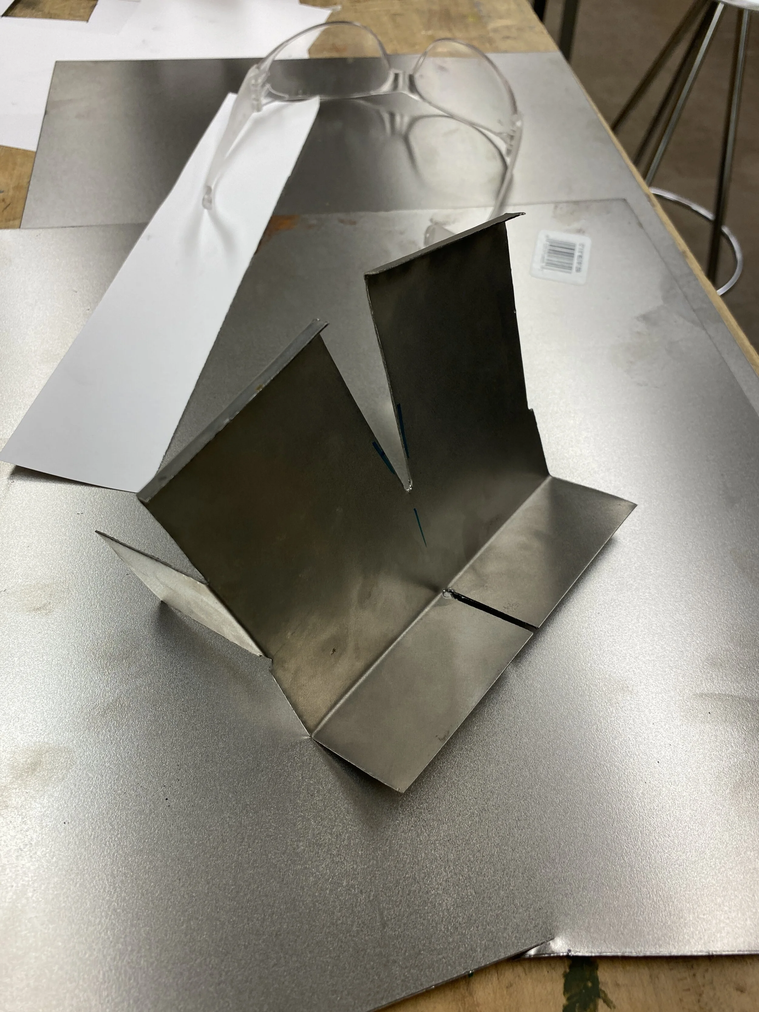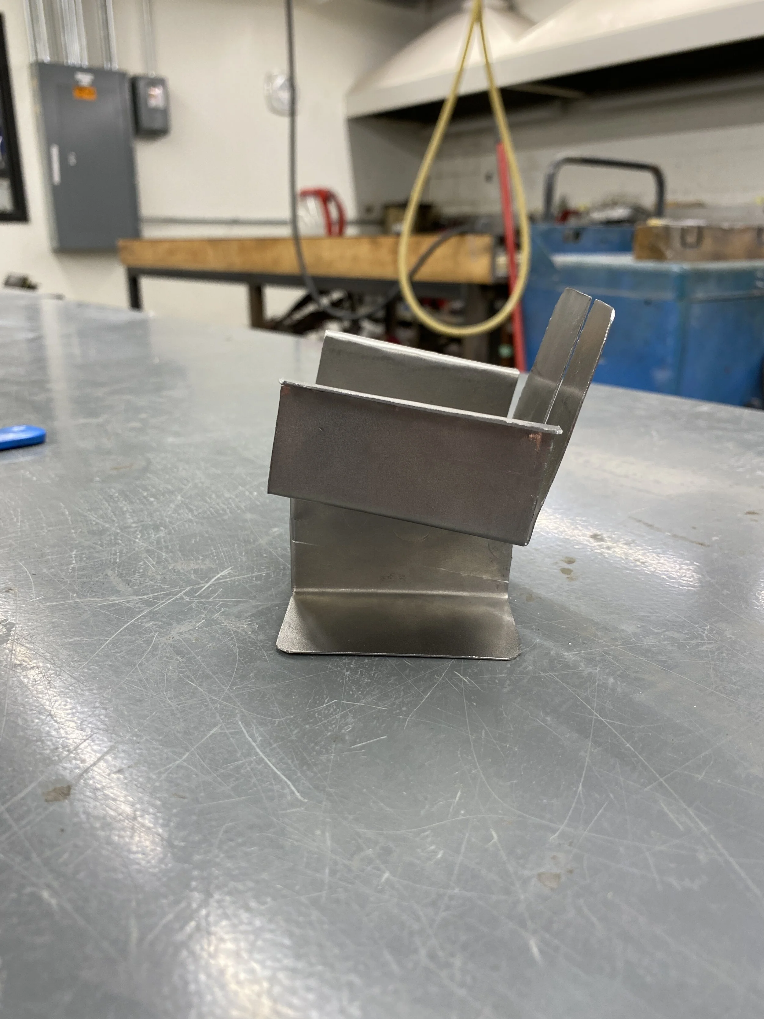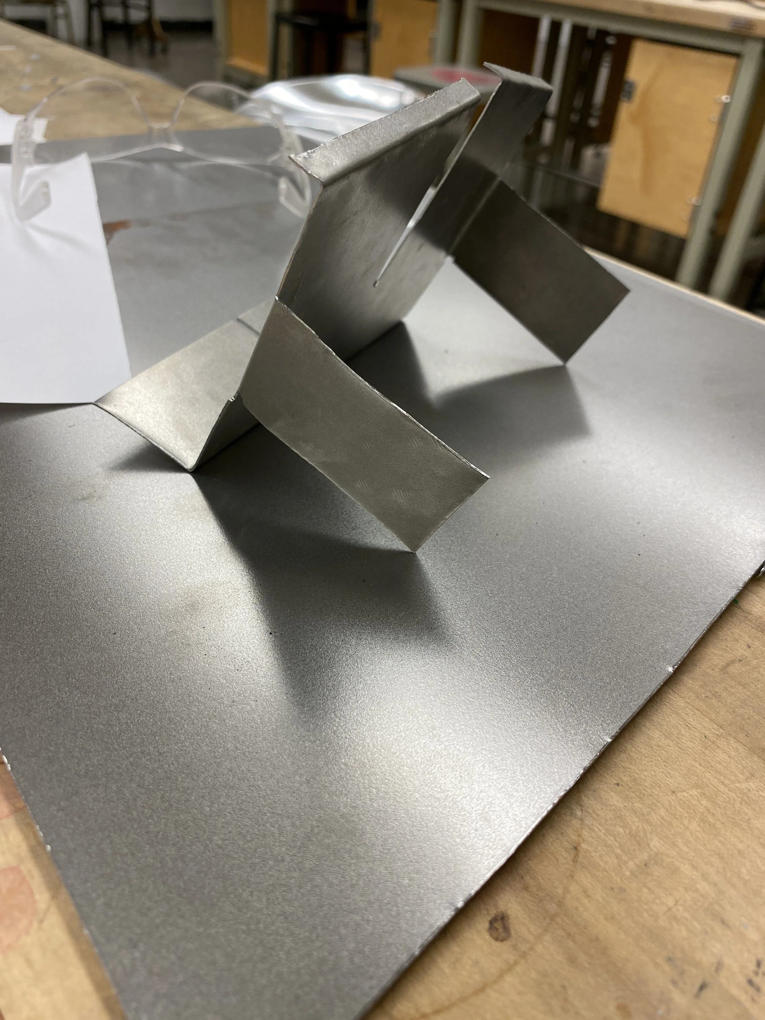 A 1:8 scale steel model was fabricated out of a single steel sheet to work out the order of operations when using a sheet metal brake.