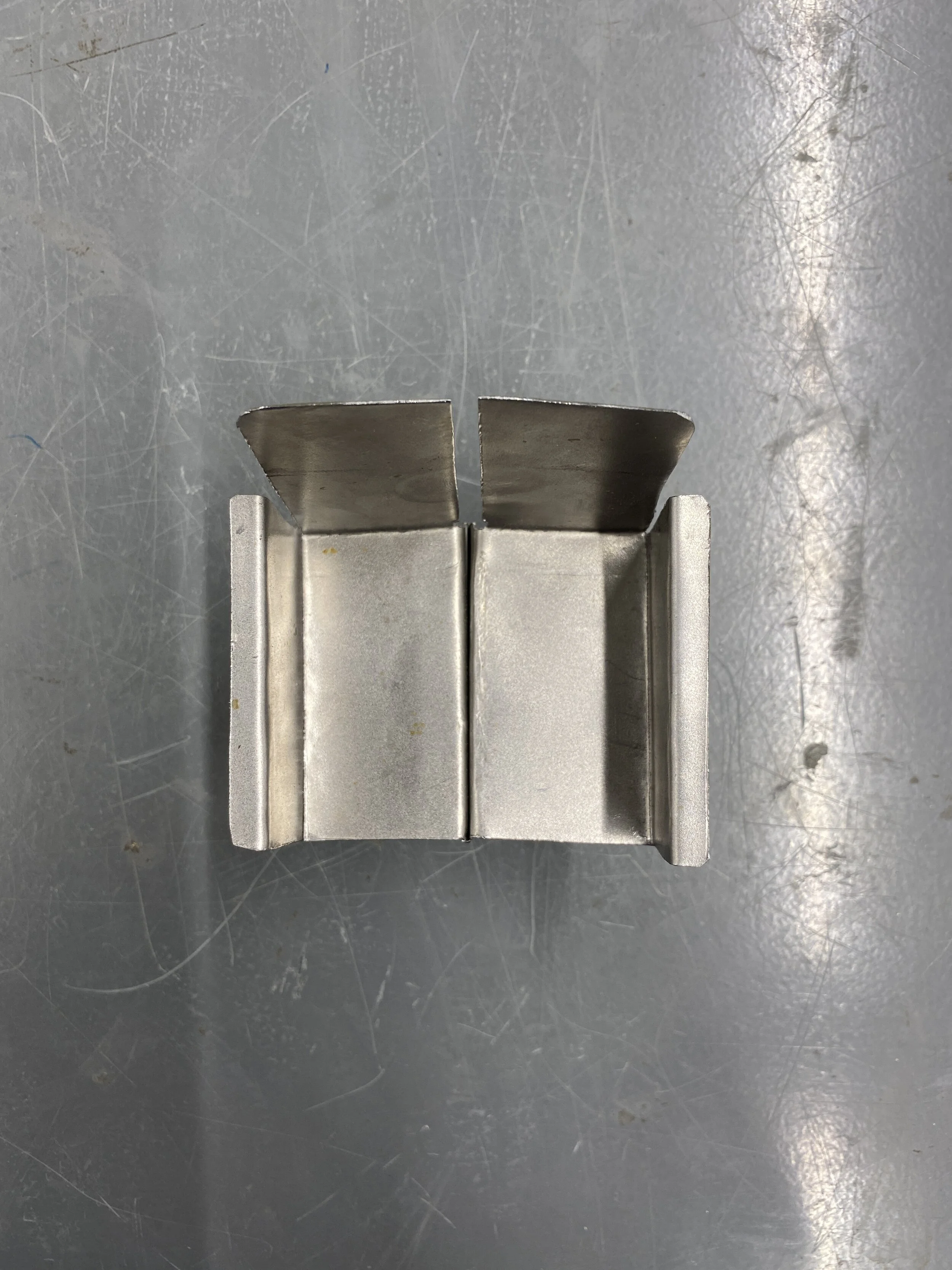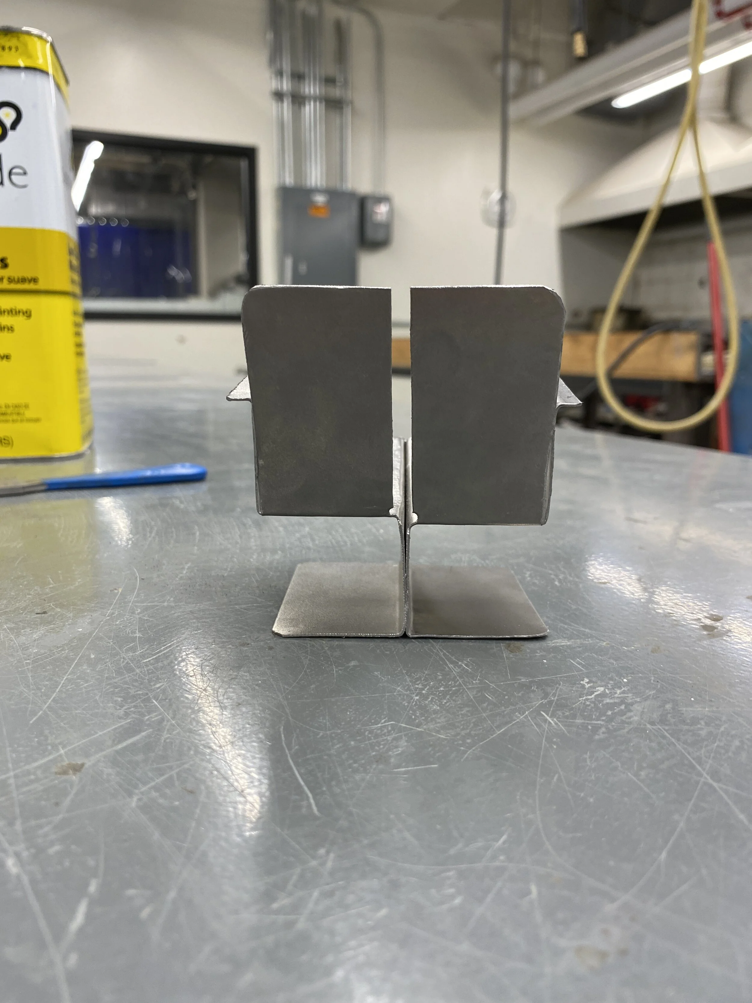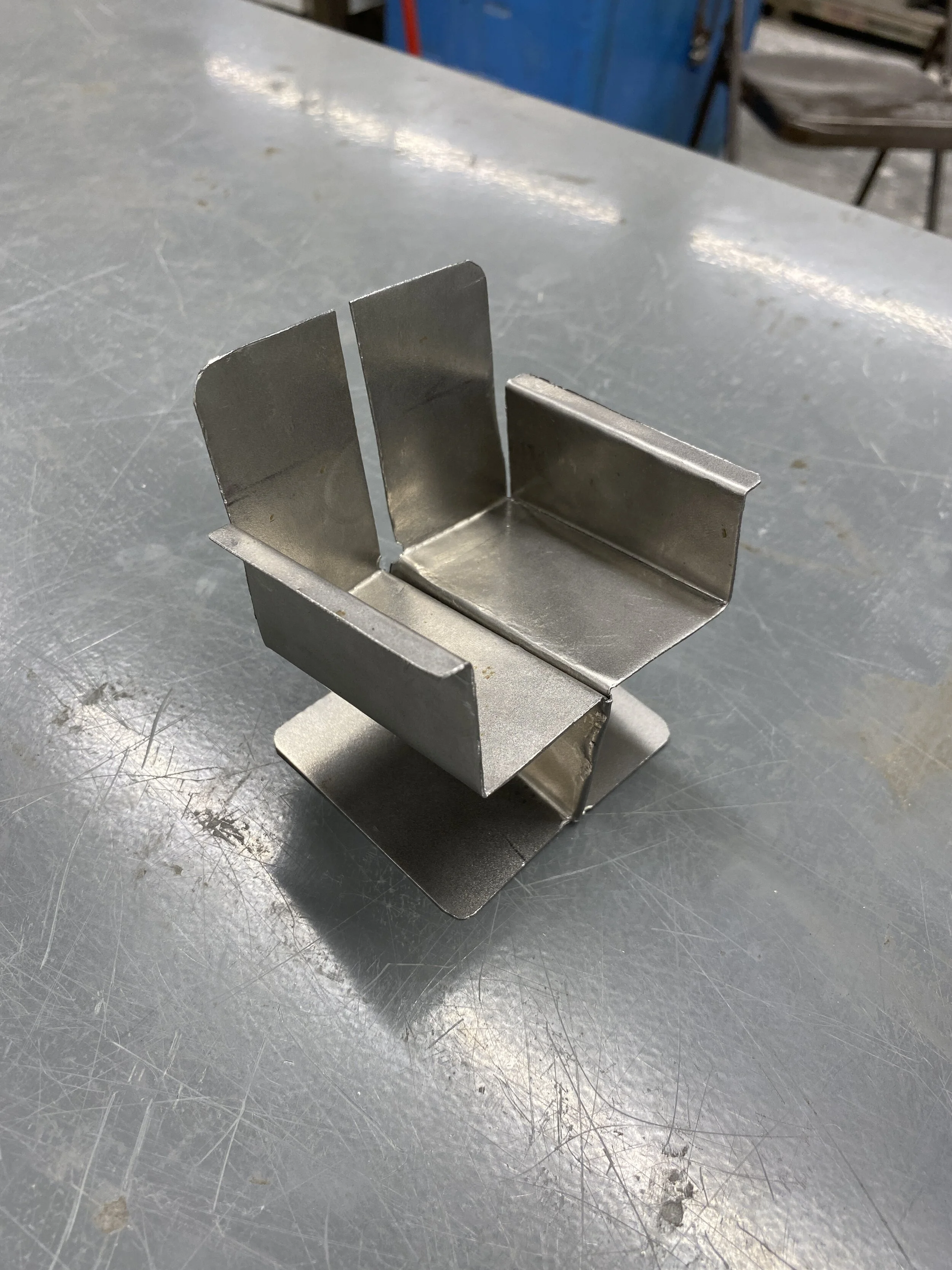 A 1:8 scale steel model was fabricated out of a single steel sheet to work out the order of operations when using a sheet metal brake.